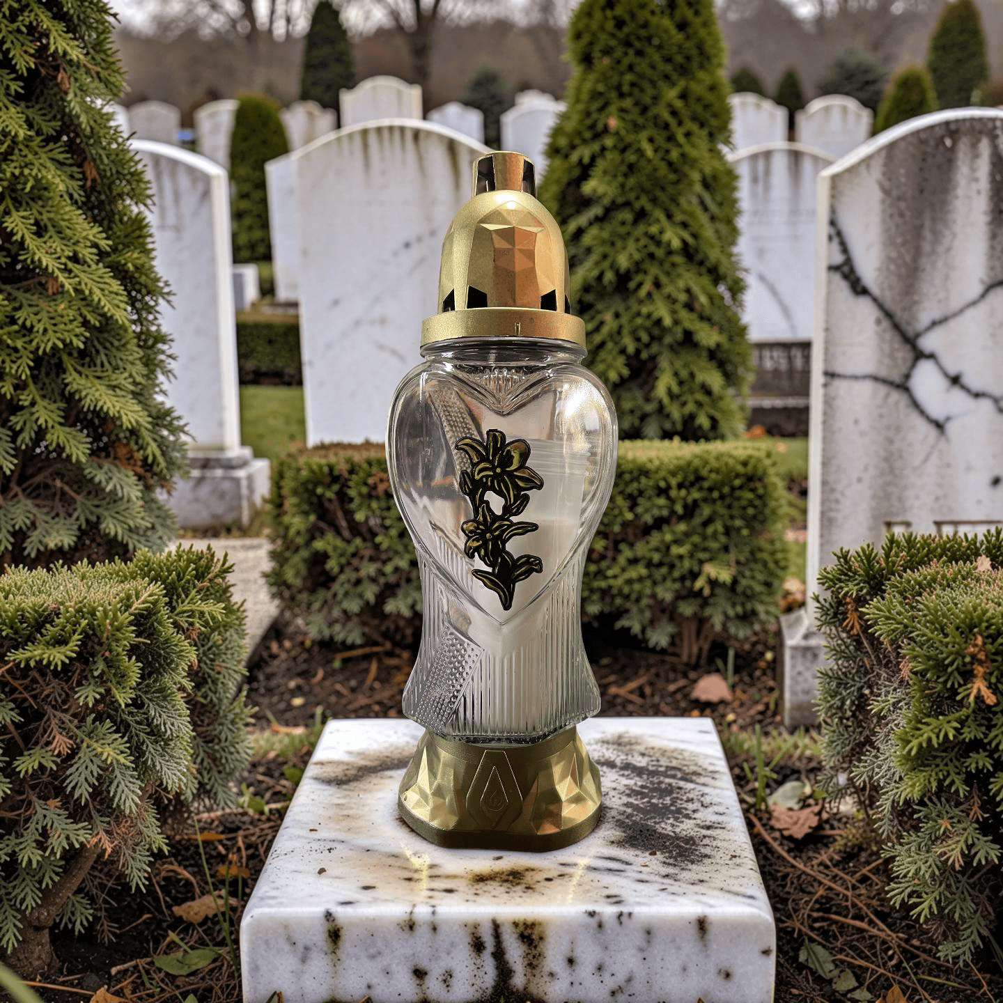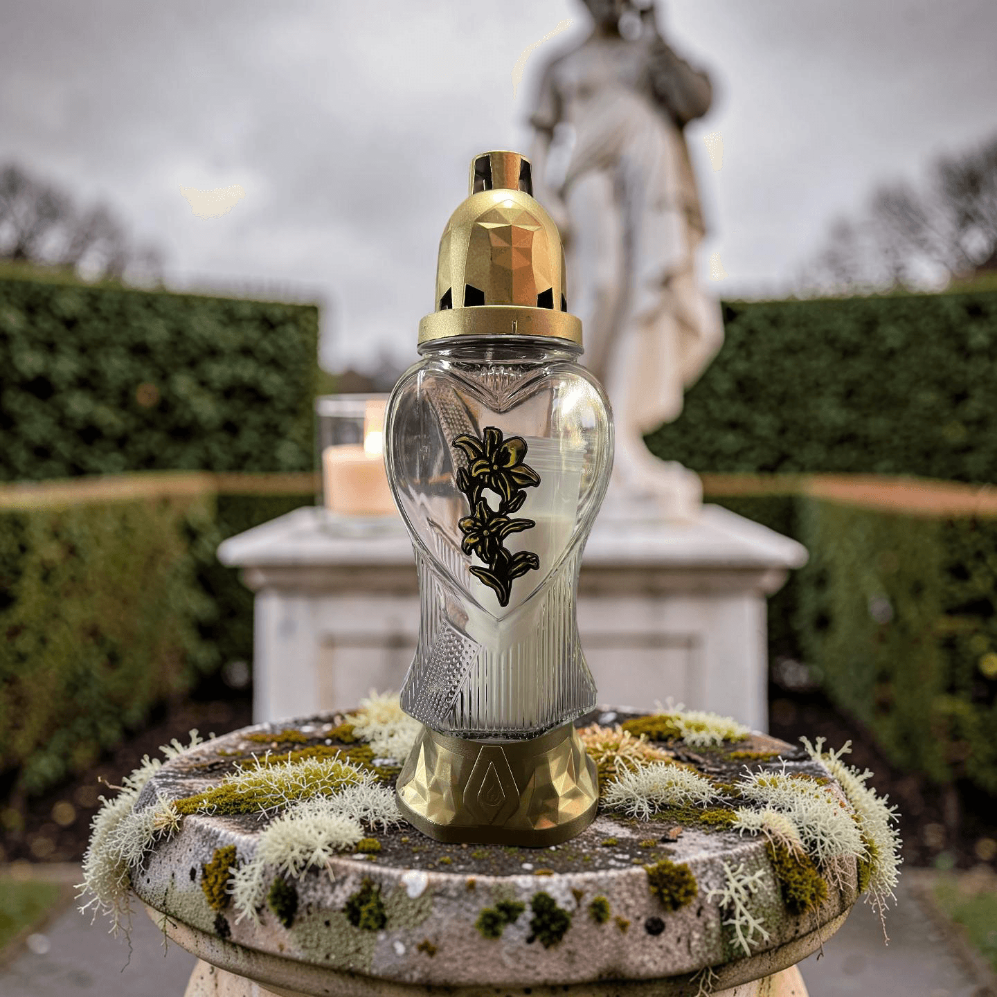 Kapų žvakidė su dekoratyvine gėle ir aukso spalvos apdaila – tai išskirtinis ir estetiškas pasirinkimas, skirtas pagerbti artimųjų atminimą. Ši žvakidė pasižymi subtiliu dizainu, kuriame dera klasikinė forma, dekoratyviniai elementai ir švelni prabanga, suteikianti kapavietei tvarkingą bei išpuoselėtą išvaizdą.